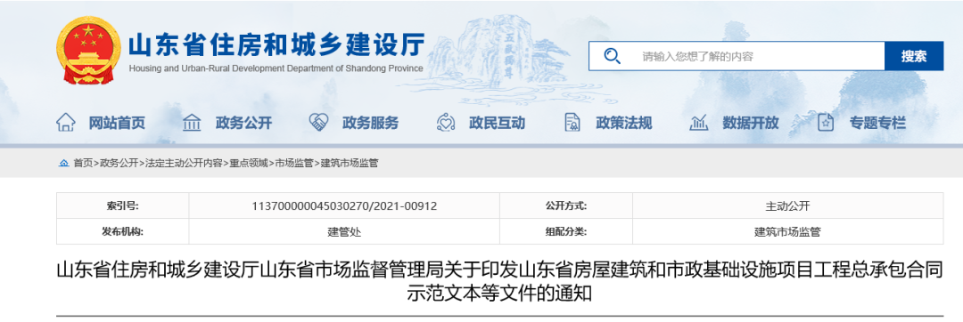 【概要描述】山東省住房和城鄉建設廳山東省市場監督管理局關於印發山東省房屋建築和市政基礎設施項目工程總承包合同示範文本等文件的通知