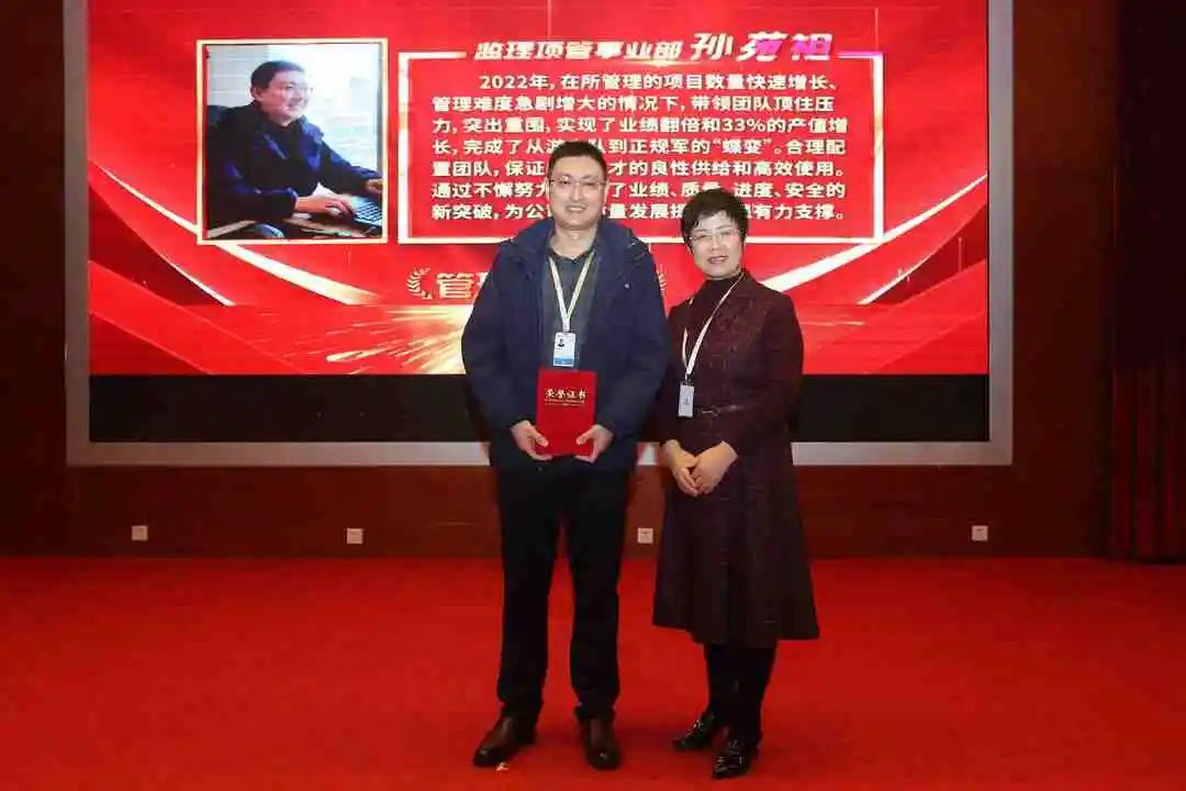 副總裁戰偉先生宣讀(dú)公司表彰決(jué)定。對公司2022年度先進團隊和先進個人進行隆重表彰,頒(bān)發瞭(le)優秀團隊、優秀項目部、管理精英、優秀員工獎、最佳新人獎、業務精英獎、質量安全獎等13個獎項,共計37名獲獎人(團隊)上台領獎。